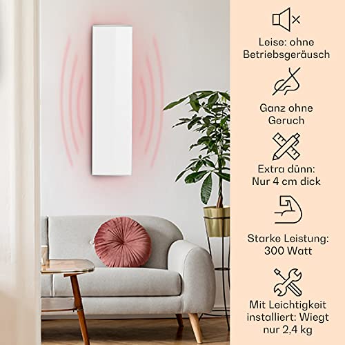 Klarstein Wonderwall- Infrarotheizung mit Thermostat, Infrarotheizkörper mit Carbon Crystal Technik, Wochentimer, Auto- Abschaltfunktion, IP24, 30 x 100 cm Heizpanel, 300 Watt, weiß