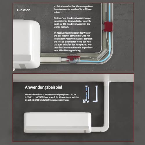 Die Kondensatwasserpumpe EASY FLOW Lusso 11 L sorgt in Split-Klimageräten zuverlässig für einen sicheren Abtransport von Kondenswasser. Mit einer Pumpenleistung von 11 Litern pro Stunde unterstützt sie den feuchten Betrieb Ihrer Klimaanlage effizient. Die Pumpe erreicht eine vertikale Saugleistung von bis zu 2 Metern und eine vertikale Druckleistung von bis zu 8 Metern, wodurch das Kondensatwasser auch bei vertikal gelegenen Ableitungen abgeführt werden kann. Der Anschluss erfolgt über eine Netzspannung von 230 V, 50 Hz. Zum Lieferumfang gehören Halteplatten für Pumpe und Behälter, zwei Klebepads, das Kondensatwasserbehälter-Set, das Pumpeinheit samt Schlauch (10 cm, 4 mm InnenØ), Ansaugschlauch (100 cm, 4 mm InnenØ), Adaptermuffe, Anschlussstecker sowie die Bedienungsanleitung. Diese Kondensatpumpe lässt sich komfortabel in SPLIT-Klimageräten einsetzen und sorgt für eine zuverlässige Kondensatableitung, sodass der Betrieb der Klimaanlage auch bei längeren Laufzeiten stabil bleibt.