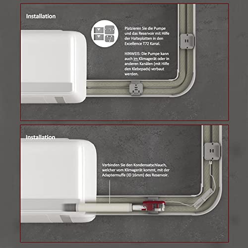 Kondensatpumpe EASY FLOW Lusso 11 L mit 11 L/h Förderleistung, 2 m Saugleistung, 8 m Druckhöhe, 230 V. Lieferumfang: Halteplatten, Klebepads, Behälter, Pumpe, Schläuche, Adapter, Stecker und Anleitung.