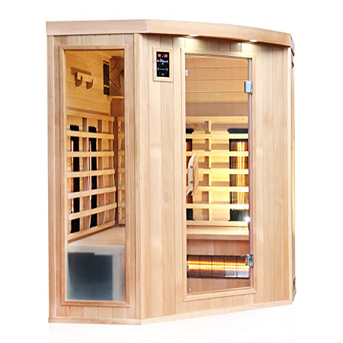 2–4 Personen Infrarotsauna mit 8 Vollspektrumstrahlern und 1 Bodenkarbonstrahler aus Hemlock-Holz, inklusive Bluetooth HiFi, LED-Farblichttherapie, Ozondesinfektion, Aroma-Therapie und automatischer Temperaturregelung.