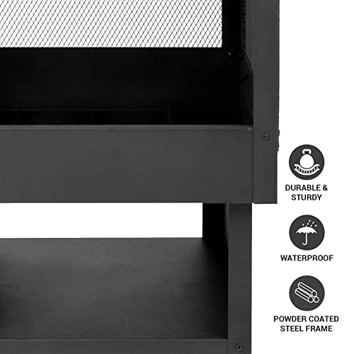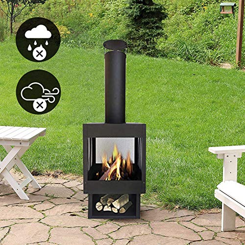 MaxxGarden Apollo Terrassenkamin in Schwarz mit großem Holz-Stauraum, wind- und rauchschutz durch langen Schornstein. Geeignet für Terrasse, Garten und Balkon.