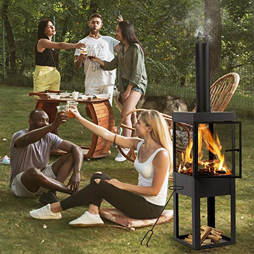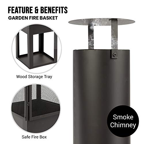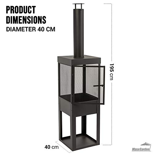 MaxxGarden Gartenkamin- Terrassenkamin- Outdoor Kamin Feuerstelle- Mit Stahlgitter- Brennholzablageort- Mit Funkenschutz Zum Entspannen- Ø40 x 195 cm- Schwarz