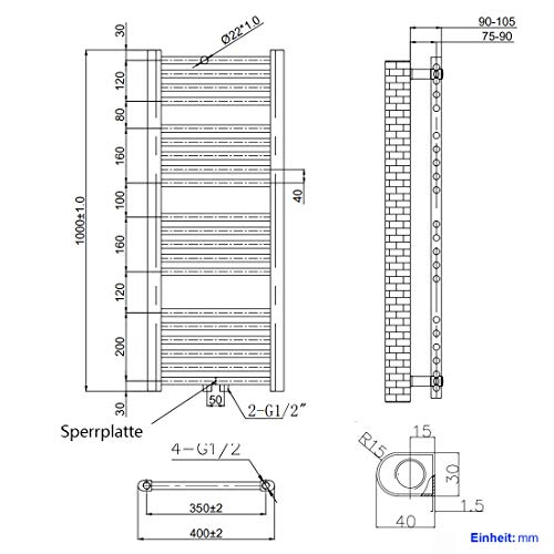 - Handtuchheizkörper Maße: 1000mm (Höhe) x 400mm (Breit), Energieart: Warmwasser, Wärmeleistung: 356W, Geeignet für Raumgröße: 3 m², Abstand von der Wand zur Außenfläche des Produkts: 90 – 105 mm, für alle Standard G1/2″ Gewinde.