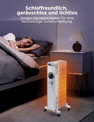 Kompakter 3-Stufen-Ölradiator mit ECO-Modus, 1500 W, leiser Betrieb und Kippschutz. Flexible Platzierung dank Rollen, 34,5 × 28 × 64 cm – ideal für Räume bis ca. 20 m².