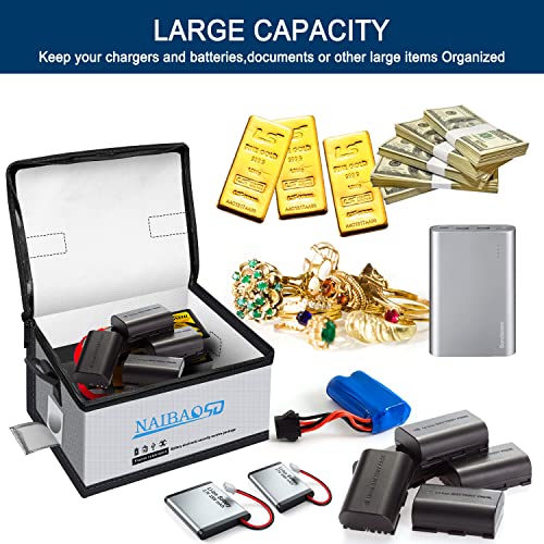 Feuerfeste, explosionsgeschützte Lipo-Tasche von NAIBAOSD: rundum geschützt beim Laden, Transport und Lagern von LiPo-Batterien dank drei Schichten aus Fiberglas und Aluminiumfolie. Großzügige Kapazität, faltbar, mit robustem Reißverschluss und abnehmbarer Tragegurt.