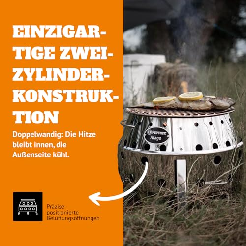 Petromax Atago | Grill, Herd & Feuerschale in einem | raucharm | Edelstahl | kippsicher | platzsparend | robust | für Dutch Oven | Hitzeschutz |Camping | kontinuierliche Sauerstoffzufuhr durch Belüftungsöffnungen, 42 x 42 x 28 cm