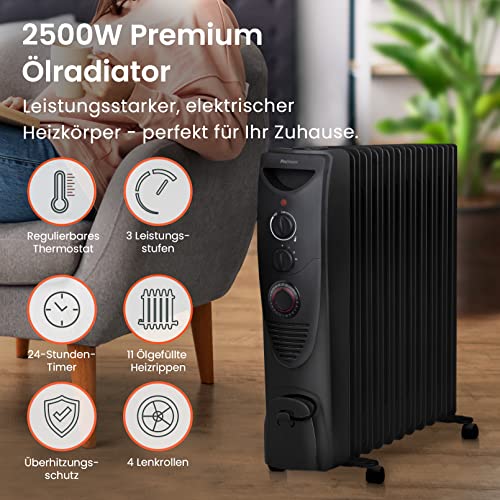 Pro Breeze 2500W Ölradiator energiesparend- Elektro Heizkörper mit 11 Rippen, integrierter Zeitschaltuhr, 3 Heizstufen, regulierbaren Thermostat und Sicherheitsabschaltfunktion- Schwarz