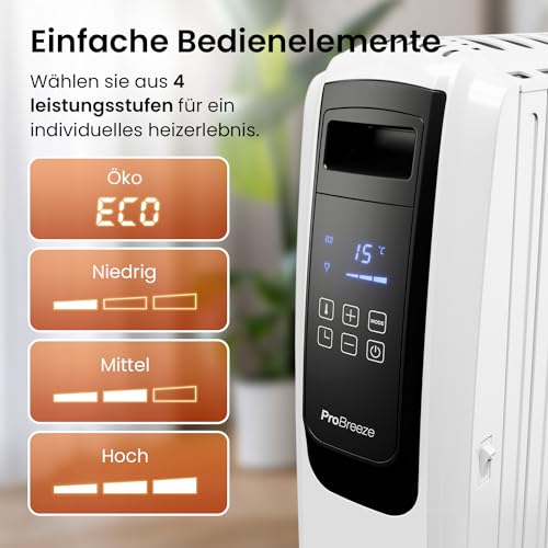 Pro Breeze Premium 2500W Ölradiator energiesparend mit digitalem Display & Fernbedienung- Heizkörper elektrisch mit 10 Rippen, 4 Heizstufen, 24h Timer, Thermostat & Überhitzungsschutz
