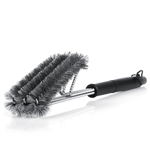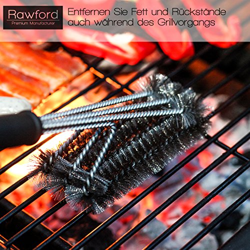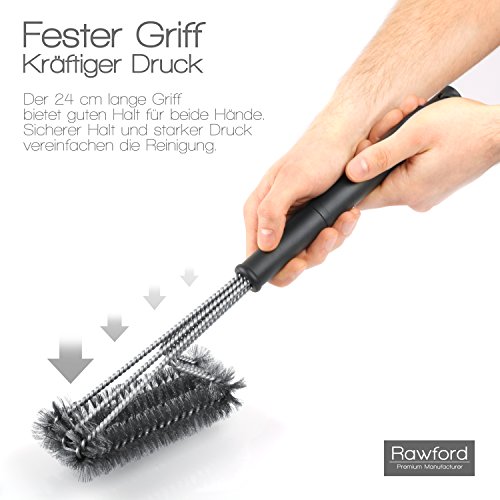 Drei Edelstahlbürsten in einem Design, 45 cm langer Griff für sichere Reinigung aus Abstand. Universell einsetzbar für Gas, Infrarot, Holzkohle, Keramik und Porzellan.
