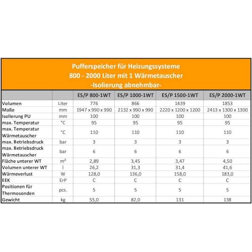 Der Pufferspeicher ES/P 1000 mit 1 Wärmetauscher bietet eine verlässliche Lösung für Heizungssysteme mit entsprechendem Wärmebedarf. Dank der 100 mm starken Isolierung reduziert er Wärmeverluste und sorgt so für eine effiziente Nutzung der Heizenergie. Der Wärmetauscher verfügt über eine Fläche von 3,45 m² und ermöglicht eine effektive Wärmeübertragung innerhalb des Systems. Die kompakte Bauhöhe von 2.002 mm, Breite 1.050 mm und Tiefe 1.050 mm schafft ausreichend Nutzvolumen bei einem Gewicht von 224 kg. Das System eignet sich für den Einsatz in Warmwasserspeicher-Anwendungen und ergänzt bestehende Heizungskonzepte durch zusätzlichen Pufferspeicher.