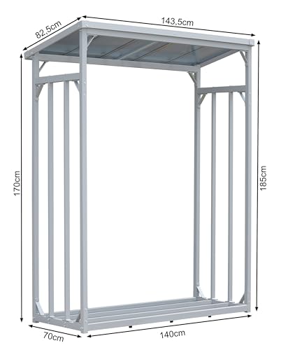 QUICK STAR Aluminium Kaminholzregal Außen 143 x 70 x 185 cm, Pro- 40 mm Aluprofil, Grau, Wetterfest, Kapazität 1, 8 m³ (2, 6 SRM), XL Garten Kaminholzunterstand Stapelhilfe
