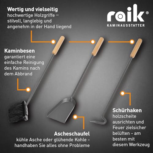 raik Kaminbesteck Otto 3- teilige Kamingarnitur aus Besen Schaufel Schürhaken im Ständer 64 cm Holzgriffe Stahl Grau für Kaminöfen, Feuerstelle, Küchenherd Kaminpflege