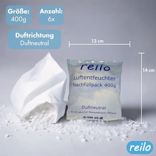reilo 6x 400g Luftentfeuchter Granulat (Calciumchlorid), Raumluftentfeuchter im Vliesbeutel, Nachfüllpacks für Entfeuchterboxen 400 bis 1200g, Lufttrockner für Wohnräume, Schlafzimmer, Keller