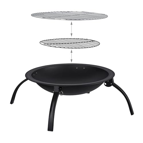 Große Fire Pit aus robustem Stahl mit Funkenschutz, zwei Rostvarianten, Grillrostheber und Schürhaken. Klappbare Beine für einfachen Transport. Durchmesser der Schale ca. 56,5 cm. Perfekt für Garten, Terrasse, Camping und Strand.