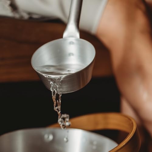 Robuste Aluminiumkelle mit hitzebeständiger Oberfläche und elegantem Bambusgriff. 43 cm Gesamtlänge, ideal für Aufgüsse mit Wasser oder ätherischen Ölen – Made in Finland.