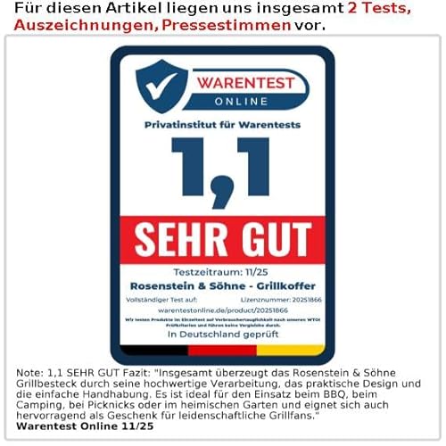 Der Rosenstein & Söhne Grillkoffer bietet ein hochwertiges 5-teiliges Grillbesteck aus rostfreiem Edelstahl in einem robusten Aluminiumkoffer. Die Besteckteile – Grillzange, Pfannenwender, Pinsel, Grillgabel und Messer – überzeugen durch Langlebigkeit und praktische Funktionen. Alle Komponenten verfügen über Ösen zum einfachen Aufhängen und sind spülmaschinengeeignet, sodass Reinigung und Ordnung auf dem Grillplatz unkompliziert bleiben. Der Koffer selbst misst 37 x 13 x 7 cm und sorgt durch sichere Klappverschlüsse für eine kompakte, transportfreundliche Aufbewahrung. Eine deutsche Anleitung ist inklusive, damit Sie sofort startklar sind. Ideal für Barbecue, Grillabende im Freien oder als praktisches Set für unterwegs. Zudem unterstützt der Aluminiumkoffer eine umweltbewusste Verpackung, da bei Einzelbestellungen der Originalproduktkarton versandsicher verschickt wird.