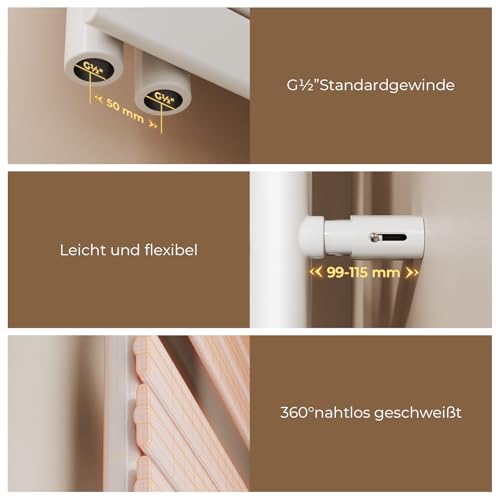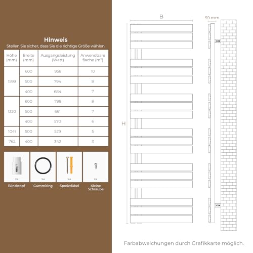 Der S’AFIELINA Design Badheizkörper vereint formschönes Design mit zuverlässiger Warmwasser-Heiztechnik. Der flache Paneel-Heizkörper mit Mittelanschluss schafft angenehme Wärme im Badezimmer und dient gleichzeitig als Handtuchtrockner. Mit einer Abmessung von 762 × 400 mm und einer Leistung von 342 W bietet er ausreichend Wärmeleistung für kleine bis mittelgroße Bäder. Die hochwertige Stahlkonstruktion gewährleistet eine lange Lebensdauer sowie eine sichere Funktion ohne Undichtigkeiten. Die Ventilanschlüsse können links oder rechts positioniert werden, sodass sich der Heizkörper flexibel an unterschiedliche Installationssituationen anpasst. Die Lieferung umfasst eine Installationshilfe und eine Bohrloch-Schablone, wodurch der Aufbau einfach und präzise erfolgt – ideal für die Installation an vorhandenen Heizungsrohren in Zentralheizsystemen. Bitte beachten Sie, dass kein Thermostatventil im Lieferumfang enthalten ist; dieses muss separat erworben werden. Die Farbgebung erfolgt in Weiß (RAL9016) und entspricht den europäischen Normen EN 442 hinsichtlich Heizleistung. Für eine sichere Montage empfehlen wir eine Befestigung an einer massiven Betonwand statt an Gipskartonplatten.