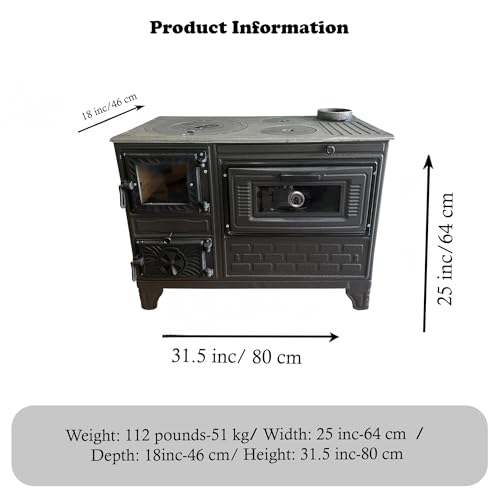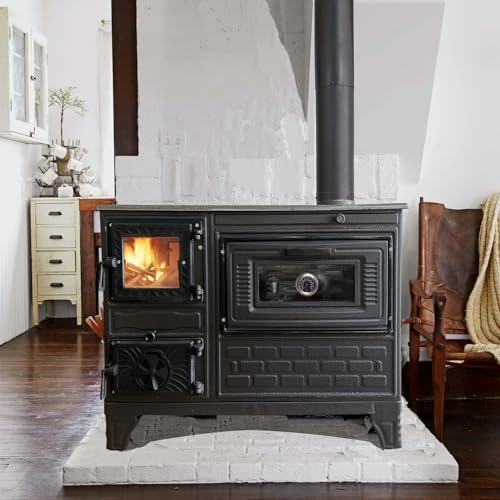 Der schwarze Gusseisenofen mit Backofen vereint robuste Bauweise mit gemütlicher Wärme und einer praktischen Kochfunktion. Gefertigt aus Gusseisen, überzeugt der Herd durch Langlebigkeit und zeitloses Design. Der Kaminbereich ist ziegelsteinverkleidet und ergänzt das warme, authentische Ambiente eines traditionellen Ofens. Mit einer Kochbreite von 39,9 cm bietet der Ofen ausreichend Platz zum Zubereiten von Speisen, während die Rauchabzugskonfiguration flexibel angepasst werden kann: Der Durchmesser beträgt 13 cm und lässt sich via Konverteradapter auf 15 cm erweitern. Die Ofenhöhe beträgt 63,5 cm, Breite 80 cm und Tiefe 45,7 cm; das Gewicht beläuft sich auf 50,8 kg. Ofenrohre sind nicht im Lieferumfang enthalten, der Schornstein-Durchmesser-Umwandler wird als kostenloses Geschenk beigelegt. Dieser Ofen eignet sich ideal zur Beheizung von Räumen bis ca. 92,9 m² und sorgt durch das natürliche Flammenbild aus echten Holzscheiten für eine behagliche Atmosphäre. Ideal geeignet für die Nutzung als Temperaturquelle, Kochstelle und dekoratives Kaminfeuer – damit wird der Wohnraum schnell zu einer Wohlfühloase.