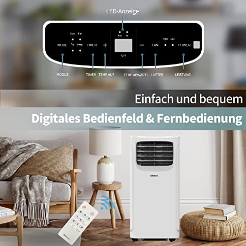 Die SHINCO Mobile Klimaanlage bietet flexibel kühlen, lüften und entfeuchten in einem kompakten Gerät und eignet sich ideal für Räume bis ca. 22 m². Drei integrierte Modi ermöglichen eine bedarfsgerechte Anpassung an heiße Sommertage, feuchte Witterung oder einfach nur eine angenehme Luftzirkulation. Der Kühlmodus sorgt für schnelle Abkühlung, der Ventilatormodus verteilt die Luft gleichmäßig, und der Entfeuchtungsmodus reduziert überschüssige Feuchtigkeit zuverlässig. Ein 24-Stunden-Timer sowie der Schlafmodus ermöglichen eine energiesparende Nutzung über längere Zeiträume, ohne dass es nachts zu unnötigem Temperaturwechsel kommt. Das Gerät wird über ein intelligentes LED-Panel bedient und per Fernbedienung gesteuert; vier Rollen erleichtern den Transport von Raum zu Raum. Der hintere Filter lässt sich einfach zur Reinigung entnehmen, und das Kühlmittel R290 ist umweltfreundlich und frei von Fluorkohlenwasserstoffen. Die Installation erfolgt schnell über eine Fensterabdichtung inklusive Abluftschlauch; der Montageaufwand ist mit wenigen Minuten überschaubar. Für Rückfragen steht der Shinco-Support bereit.
