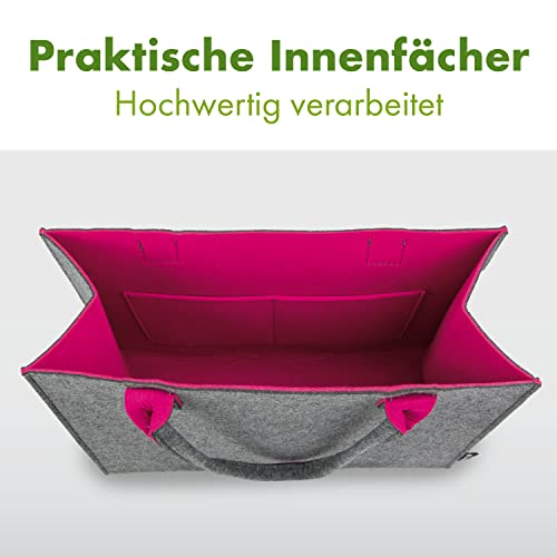 Robuste Filztasche mit 5 mm Stärke, tragfähig bis 20 kg Kaminholz. XL-Volumen ca. 40 x 27 x 17 cm (18 l), außen Grau, innen Magenta. Extra lange Henkel, waschbar bei 30 °C. Vielseitig einsetzbar als Einkaufstasche oder dekorativer Zeitungskorb.
