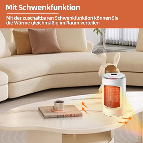 Kompakter PTC-Heizlüfter mit Keramik-Heizelement für Räume bis 12 m². Zwei Leistungsstufen (600/1200 W), Schwenkfunktion, Display, Timer und sichere Bedienung durch Umkippschutz und Überhitzungsschutz.