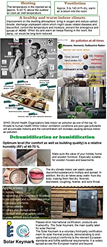 Solarbetriebene Lüftung, Entfeuchtung und Beheizung mit LCD-Thermostat. Automatischer Wechsel zwischen Solar- und Stromversorgung für frische Luft, weniger Heizkosten und gesundes Raumklima.
