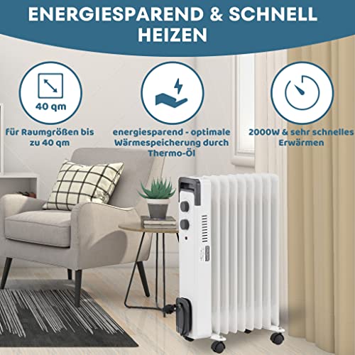 Energiesparender Ölradiator für Räume bis 40 m² mit 2000 W, Thermostat, drei Heizstufen und Kippschutz. Leise, mobil dank Rollen – ideal für Wohn- und Arbeitsräume.