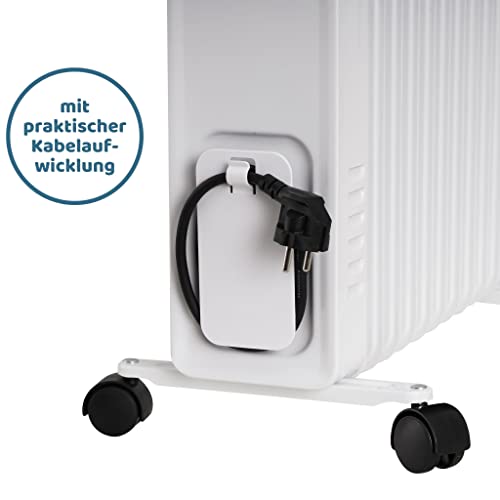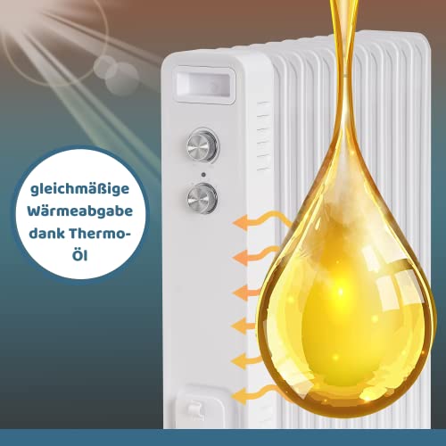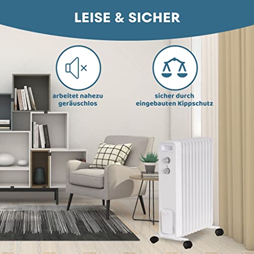 ENERGIESPAREND BEHEIZEN BIS 50 m²: Ölradiator mit Thermoöl, 2500 W, 3 Heizstufen, Thermostat, kippsicher. Leise, sicher und mobil – ideal für Räume, Allergikerfreundlich.