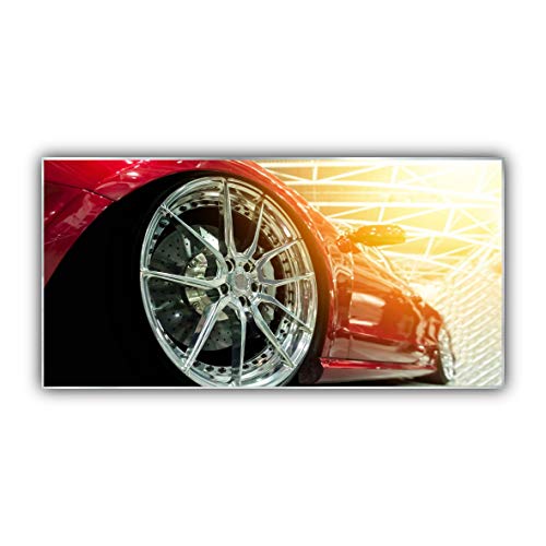 STEINFELD Glas-Bildheizung mit ESG-Sicherheitsglasfront, 7 Jahre Garantie. Wartungsfrei, einfache Installation, Kabellänge 1,5 m. Wählen Sie aus 6 Größen/Watt: 350–1200 W. Motiv: rotes Auto.