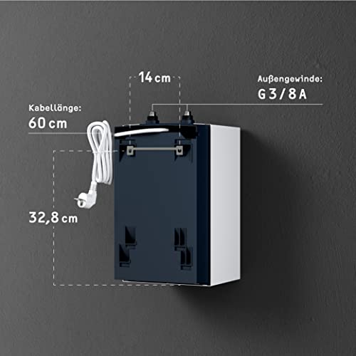 Druckloser 5-l-Kleinspeicher für die Warmwasserversorgung einzelner Zapfstellen, mit Thermostop und temperaturbegrenzter Kindersicherung. Niederdruckarmatur erforderlich; senkrechte Untertischmontage mit 230-V-Stecker.