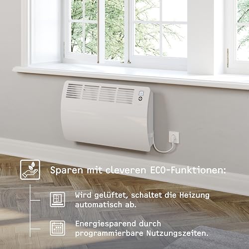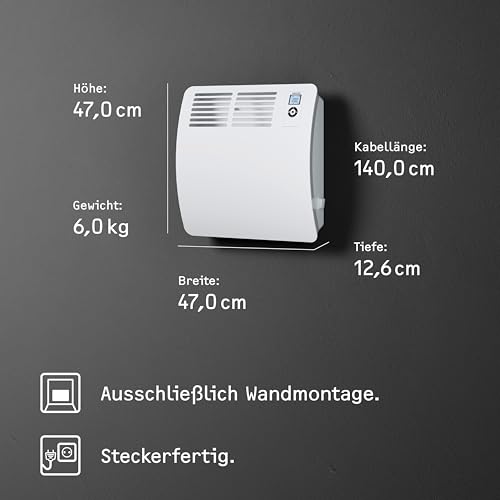 Kompakter Wandkonvektor für gleichmäßige, geräuschlose Raumheizung bis ca. 12 m². LC-Display, programmierbarer Wochentimer, 120-Minuten-Timer, Silent Mode, Bewegungssensor, Sicherheits-Temperaturbegrenzer und Kindersicherung.
