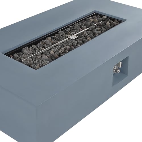 Rechteckige Propangas-Feuerstelle aus Leichtbeton (MgO) in Graphitgrau, inklusive Edelstahl-Brenner, Lavasteine, Schlauch, Regler und Schutzhülle. Keine Propangasflasche im Lieferumfang enthalten.