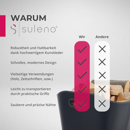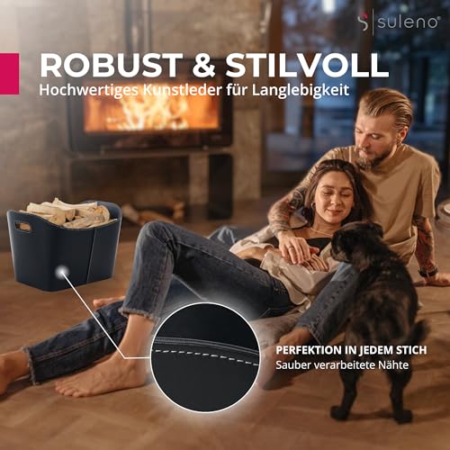 Der SULENO Holzkorb WEXFORD in Schwarz ist die vielseitige Aufbewahrungslösung für Kaminholz und Zubehör. Mit den großzügigen Maßen 35,5 x 55,0 x 42,5 cm bietet der XL-Korb reichlich Stauraum für Brennholz und eignet sich zudem als praktische Aufbewahrung für Zeitschriften, Spielzeug oder Kaminzubehör. Das pflegeleichte Kunstleder sorgt für eine saubere Optik, präzise Nähte und eine langlebige Bauweise. Durch die integrierten Tragegriffe lässt sich der Korb komfortabel transportieren. Seine elegante schwarze Farbgebung fügt sich nahtlos in verschiedenste Wohnstile ein und macht ihn zu einer stilvollen Ergänzung für Innenräume, Kamine und Öfen. Der WEXFORD-Korb überzeugt durch robusten Alltagsnutzen, klare Formen und eine großzügige Kapazität, die Brennholz sowie alltägliche Utensilien ordentlich verstaut.