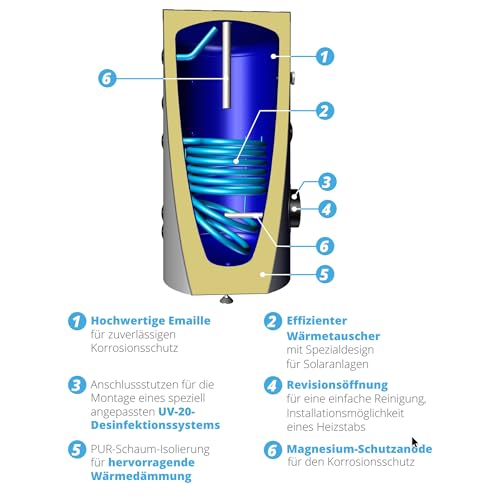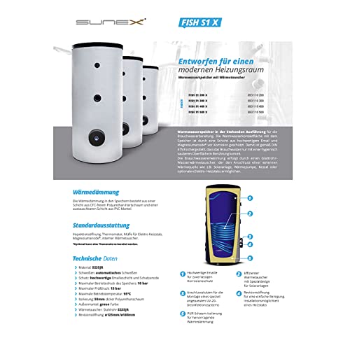 SUNEX Warmwasserspeicher 200L mit 1 Wärmetauscher, Wärmepumpenspeicher, bis 110°C, emailliert, Magnesiumanode, Wärmedämmung, Boiler, Warmwasserbereiter, Solar Speicher