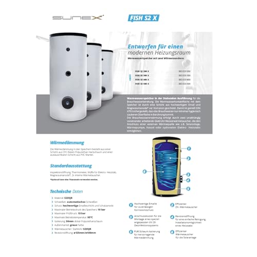 Der SUNEX Warmwasserspeicher 200L mit zwei Wärmetauschern bietet zuverlässige Brauchwasserversorgung für Heizungsanlagen mit Öl, Gas, Festbrennstoff oder Wärmepumpen. Der emaillierte Standspeicher überzeugt durch eine effektive Wärmedämmung, die Wärmeverluste reduziert und den Energieverbrauch senkt. Sicherheit und Langlebigkeit stehen im Fokus: Betriebsdruck bis 10 bar und maximale Betriebstemperatur von 95°C gewährleisten zuverlässigen Betrieb. Mehrere Anschlüsse ermöglichen den Einsatz zusammen mit Kessel, Solar- oder Wärmepumpensystemen – flexibel erweiterbar und vielseitig einsetzbar. Dank kompakter Bauweise mit optimierter Höhe und Durchmesser lässt sich der Speicher einfach transportieren, installieren und in bestehende Heizsysteme integrieren.