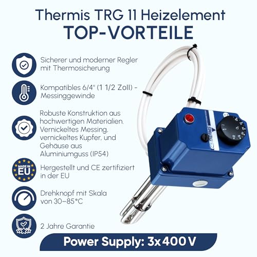 THERMIS TRG 11 Heizstab- Heizpatrone mit Thermostat, 1 1/ 2 Zoll (G6/ 4) Gewinde, 4, 5 kW 3/ 400 V (4 cable)- Heizelement für Boiler, Warmwasserspeicher, Wasserheizung
