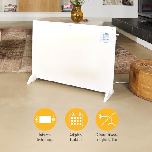 Infrarot-Panel mit 550 W für gleichmäßige Wärme über Strahlung. Einstellbarer Thermostat bis 37 °C, wöchentliche Programmierung, Überhitzungsschutz und Fenstersensorik. Wandmontage oder mobiler Einsatz möglich.