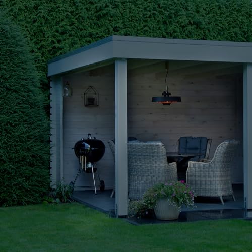 Schnelle, blendfreie Infrarotwärme für Terrasse und Outdoor-Bereiche. Zwei Leistungsstufen, Timer bis 24 Stunden, Fernbedienung mit LCD-Anzeige. IP44 geschützt, hängende Montage inklusive Kette & Karabiner.