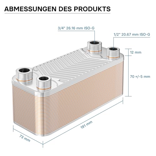 Kompakt, leistungsstark und robust: Der Wiltec Wärmetauscher 30 Platten bietet eine hohe Wärmeübertragungsleistung in einem schlanken Gehäuse. Die Durchflussmenge beträgt 4 m³/h, das Volumen je Durchgang 0,54 l. Dank gelöteter Edelstahlplatten mit spezieller Prägung ermöglicht er einen hochturbulenten Durchfluss für effiziente Wärmeübertragung. Der Kreislauf umfasst F1 F3/F4 F2. Variabel einsetzbar: Betriebstemperaturen von −195 °C bis +225 °C, Druck bis 20 bar (Europa 0,5 bar). Anschlusswerte nach ISO-G: F1 & F3 ½″ (20,67 mm) sowie F2 & F4 ¾″ (26,16 mm). Hergestellt aus Edelstahl AISI 304 und Kupfer-Lötmaterial (99,9 % Kupfer) für erhöhte Robustheit und Langlebigkeit. Idealer Wärmetauscher für Industrieheiztechnik, Kühl- und Solartechnik, Blockheizkraftwerke, Klimaanlagen, Wärmepumpen, Fußbodenheizungen und ähnliche Anwendungen.