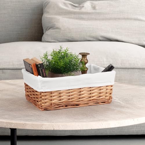 Der Woodluv Brown Wicker Aufbewahrungskorb mit Off-White Stoffinnenschuh bietet eine robuste, platzsparende Lösung zur geordneten Lagerung. Handgewebt aus umweltfreundlicher Weide, einem erneuerbaren Material, verbindet dieser Korb langlebige Struktur mit einem sanften Kontrast durch das cremefarbene Innenfutter. Das Abnehmbares Innenfutter schützt Papiere, Schreibwaren und Kleinutensilien zuverlässig und lässt sich bei Bedarf einfach reinigen. Die kompakte Größe (L 36 cm x B 24 cm x H 13,5 cm) ermöglicht eine flexible Platzierung im Regal, im Bad oder in der Küche. Die Verschachtelungsmöglichkeit der Körbe erleichtert Lagerung und Transport, sodass sich Alltagsgegenstände ordentlich verstauen lassen. Ein praktischer Begleiter für die Weihnachts- oder Alltagsaufbewahrung – elegant, funktional und nachhaltig.