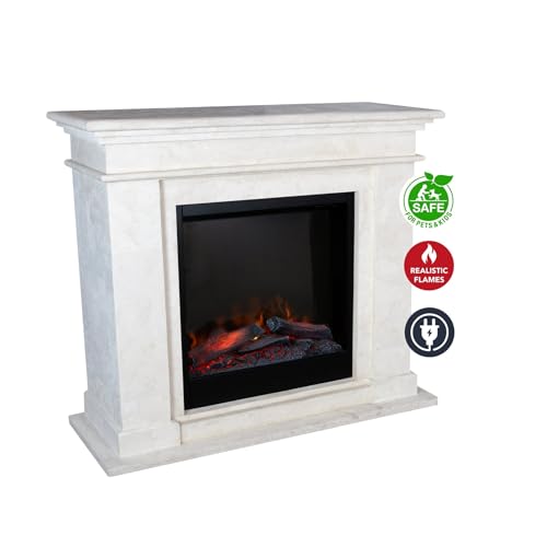 Kaminverkleidung in Naturweiß aus Naturstein mit LED-Flammeneffekt, 0/750/1500 Watt Heizleistung und Fernbedienung. Geeignet als Zusatzheizung für Räume bis ca. 22 m².